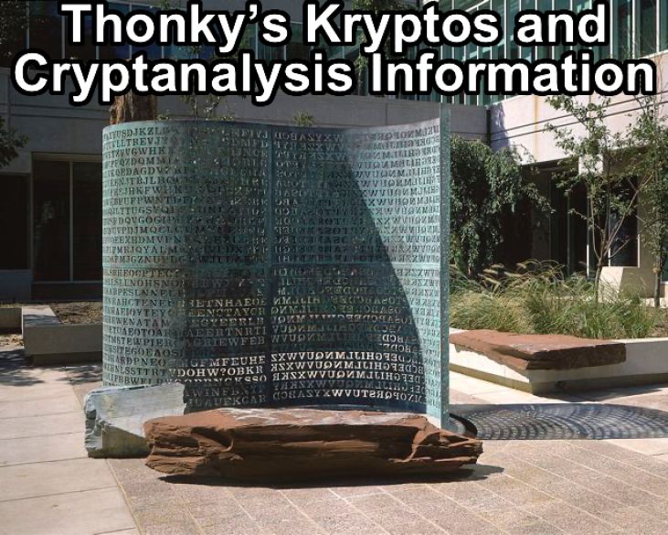 This section contains information about the Kryptos sculpture, as well as information about basic cryptanalytic techniques. Kryptos Topics Kryptos Themes Elements of the Kryptos Installation Cryptanalysis Topics Frequency Analysis Index of Coincidence Types of Ciphers Cryptanalysis Utilities Substitution Encryption and Decryption Tool Cryptanalysis Support Program Index of Coincidence Calculator Types of Ciphers Amsco Cipher Autokey Cipher Baconian Cipher Bazeries Cipher Beaufort Cipher Bifid Cipher Cadenus Cipher Checkerboard Cipher Complete Columnar Transposition CM Bifid Cipher Digrafid Cipher Foursquare Cipher Fractionated Morse