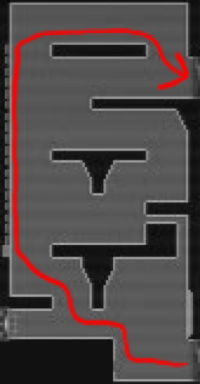 Jump up onto the ledge, then go left and through the door. Make your way downward to the lower left of the room, and go left to enter the next area.