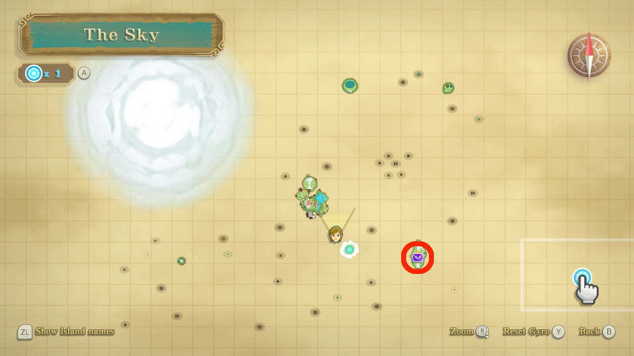 Inside the Thunderhead On a small round island between the two large islands in the north and south. Land on the southern end of the island, where there is a digging spot in the ground. Dig into it and kill the Moldorm, then go to one of the beams of light in the corner. If you emerge at the correct one, you find the chest. (The wrong one just leads to a different chest.) |