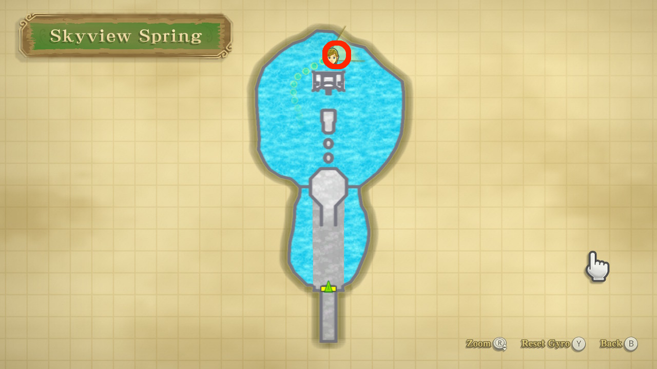 Skyloft On a floating island in eastern Skyloft. Go to the entrance of Waterfall Cave and use the Clawshots on the ivy on the floating island, then use the Clawshots on the ivy on the next island, with the pool of water in it. The chest is on the south side of this island. |